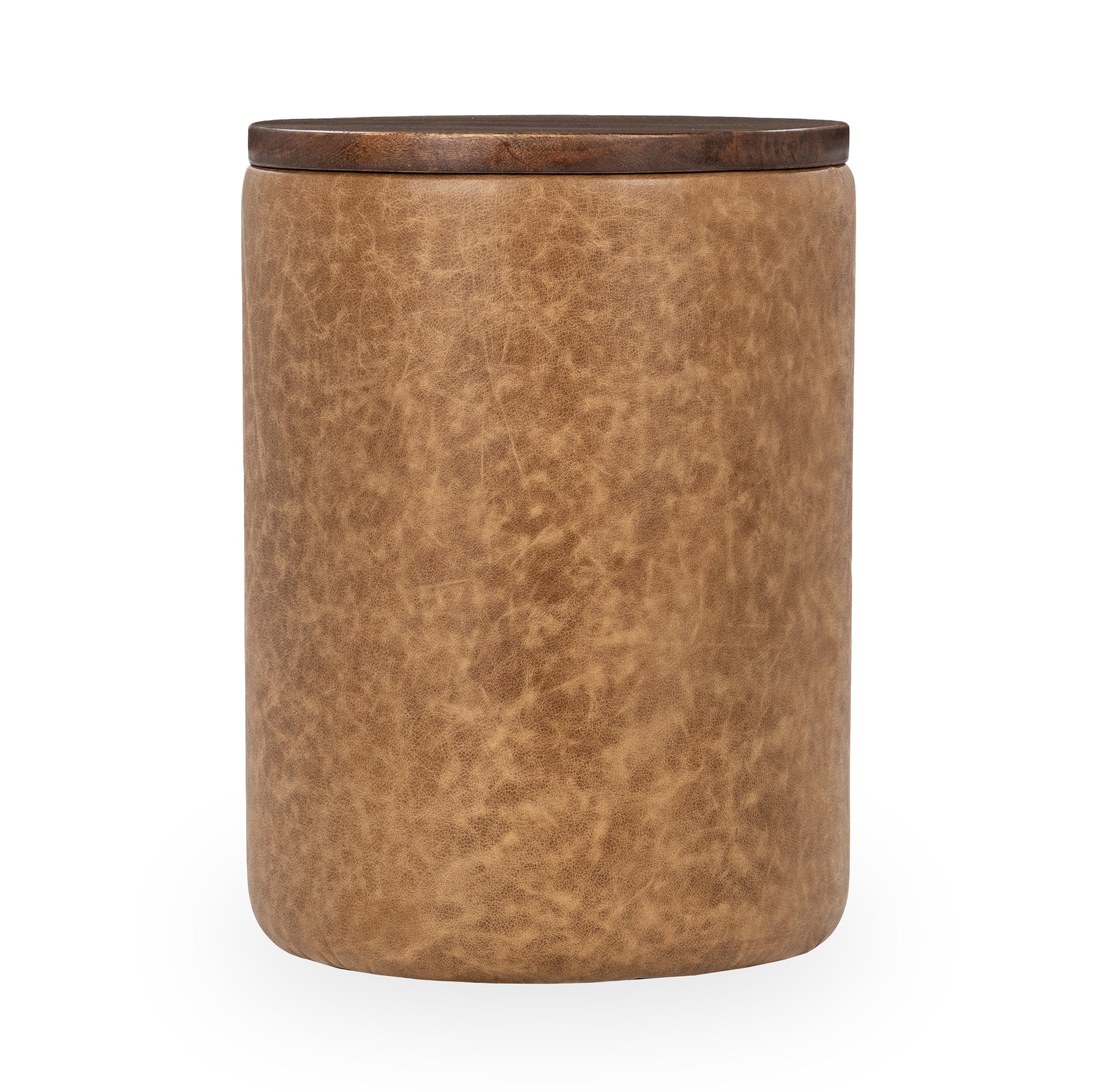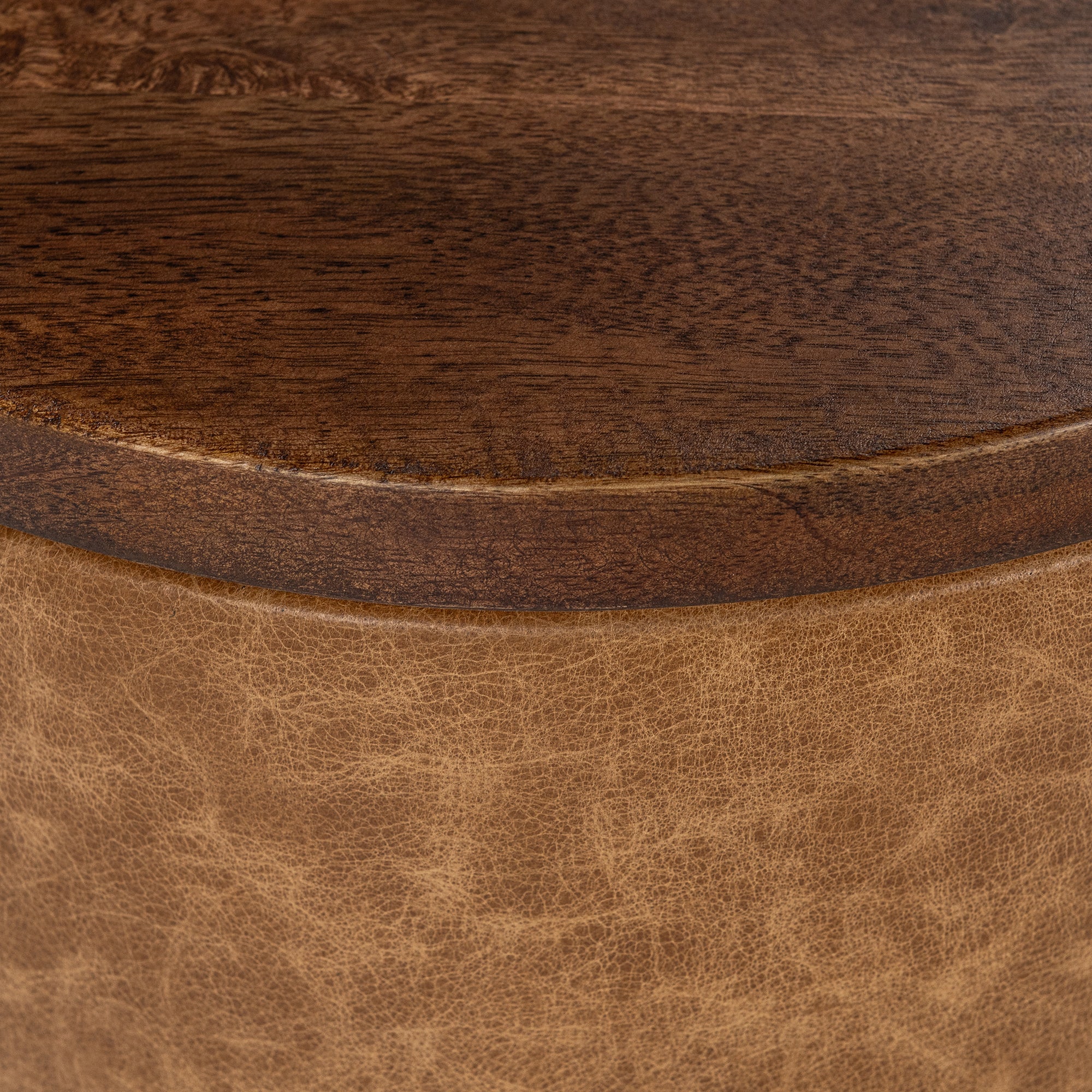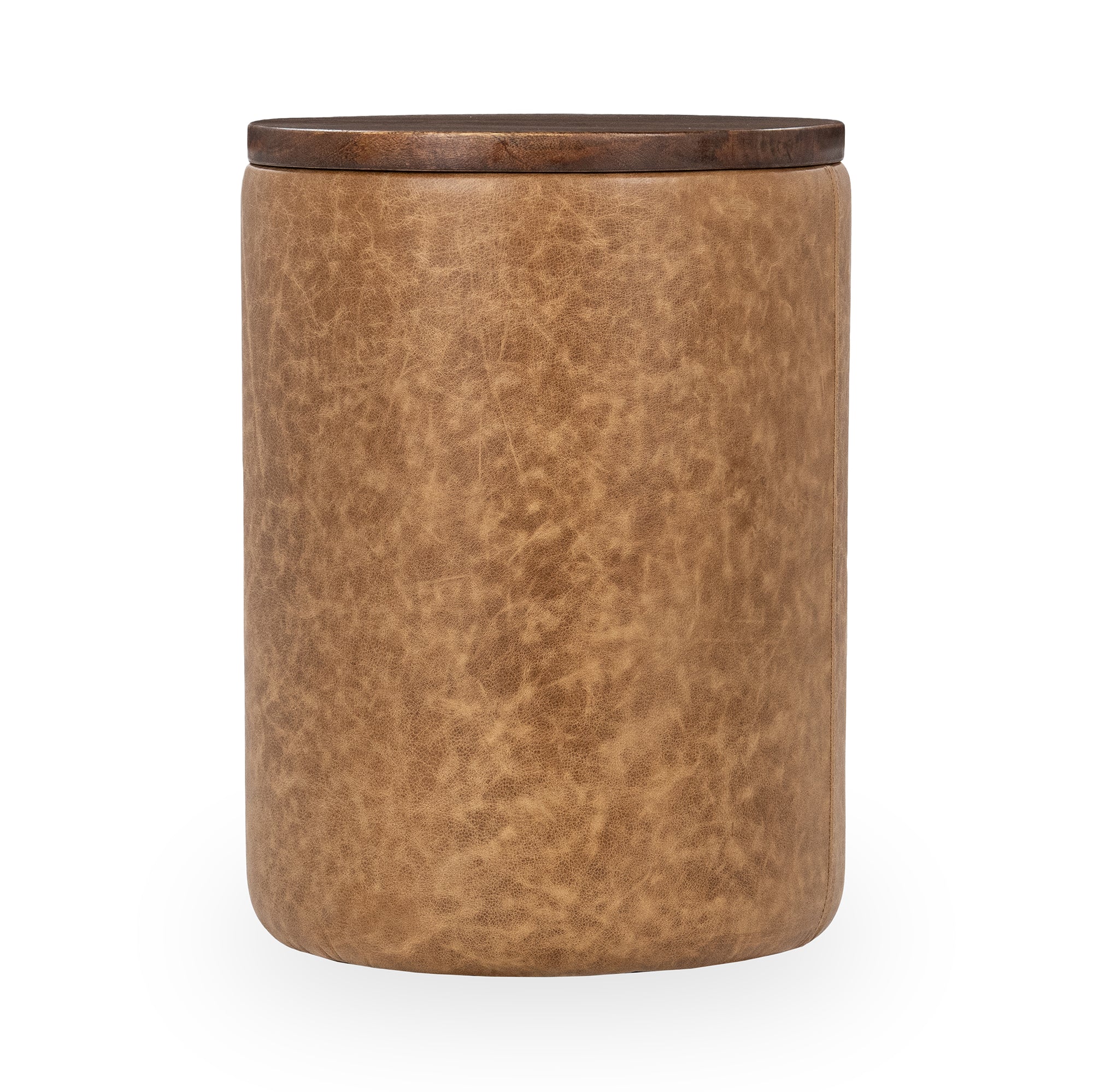 This drum-shaped Andra Accent Table is a perfect union of design and exudes understated luxury. Wrapped in top-grain leather and topped with a smooth mango wood surface, its rich textures bring depth and sophistication to any space. Available in Cocoa Brown, Chestnut and Tan.