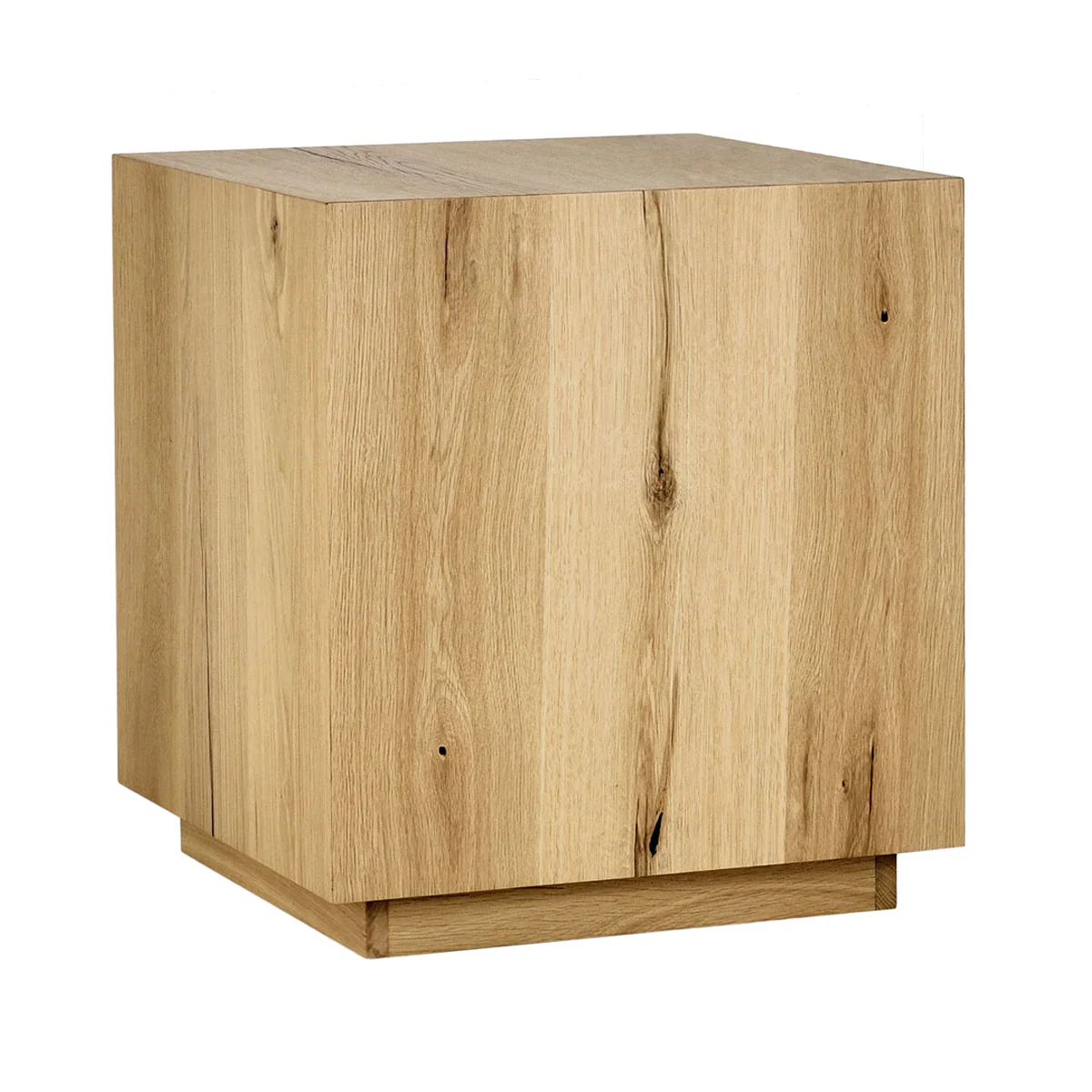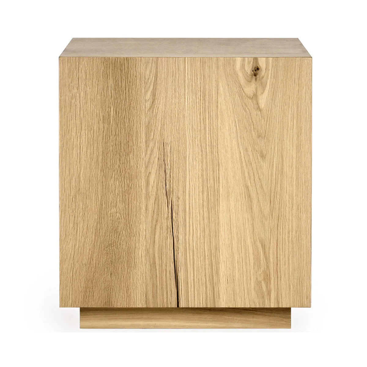 The Layne End Table features a sleek oak wood veneer construction with a stylish plinth base and a modern, minimalistic design. Its sophisticated yet simple lines and timeless appeal make it a versatile addition to any living room or lounge area.