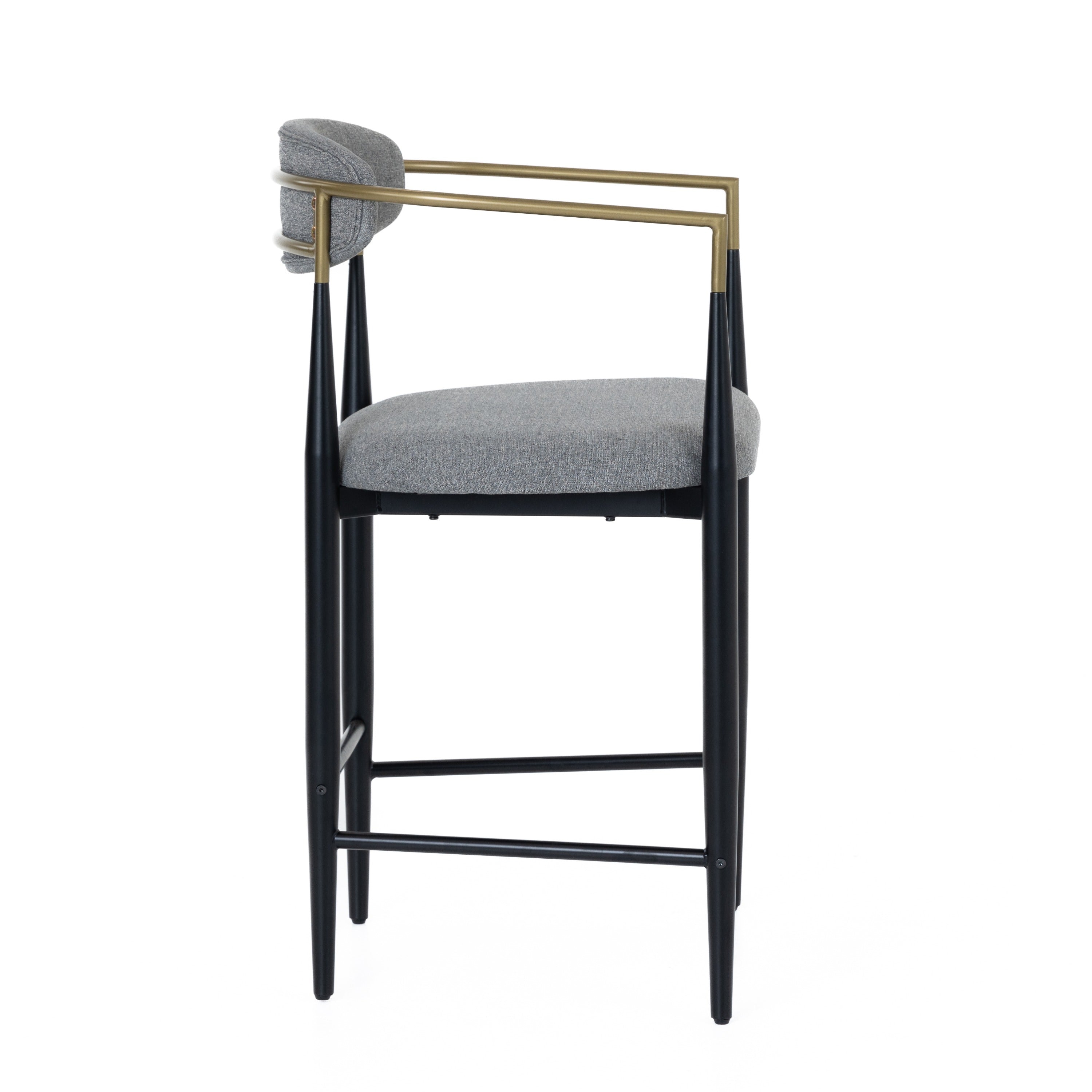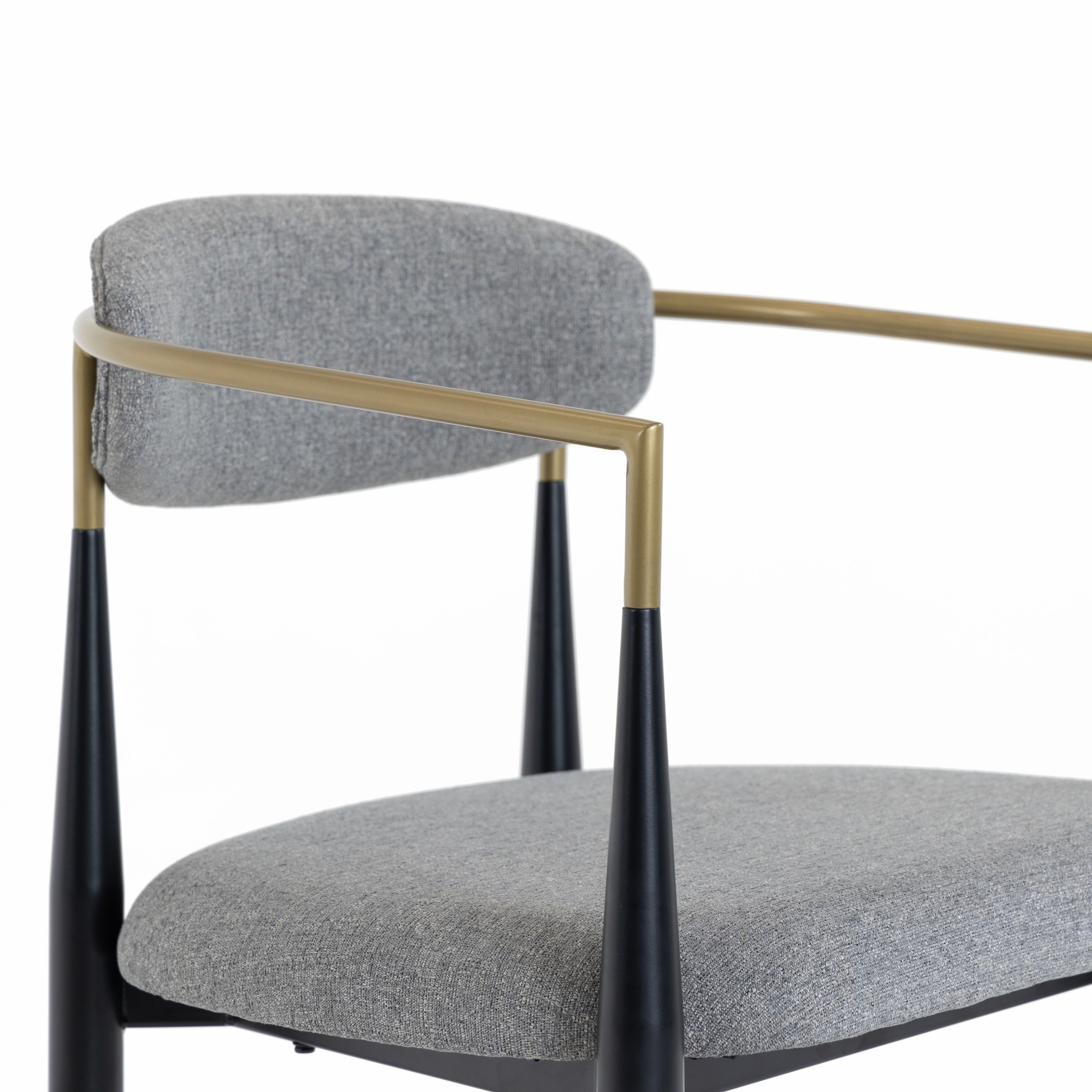The Buchtel Arm Bar Chair blends mid-century inspiration with a refined modern edge. Defined by a sleek black frame and subtle gold accents along the arms, it creates a warm contrast against its soft grey upholstery.