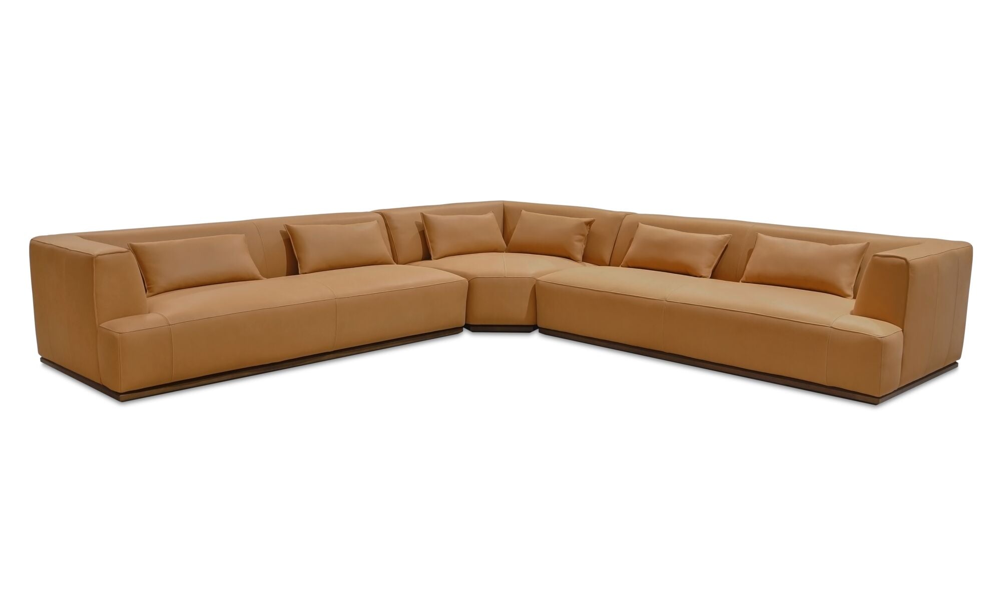 Serious room to sprawl. Clove doesn’t just fill a space—it defines it. With a deep, low-slung frame and oversized L-shape, it’s designed for maximum sprawl with minimalist intent. Wrapped in soft top-grain leather that patinas beautifully, it pairs tailored seam detailing with plush feather-fiber cushions and six toss pillows for extra comfort. The solid rubberwood base adds a grounded finish. Modern, warm, and unapologetically roomy—this one’s made for living large.