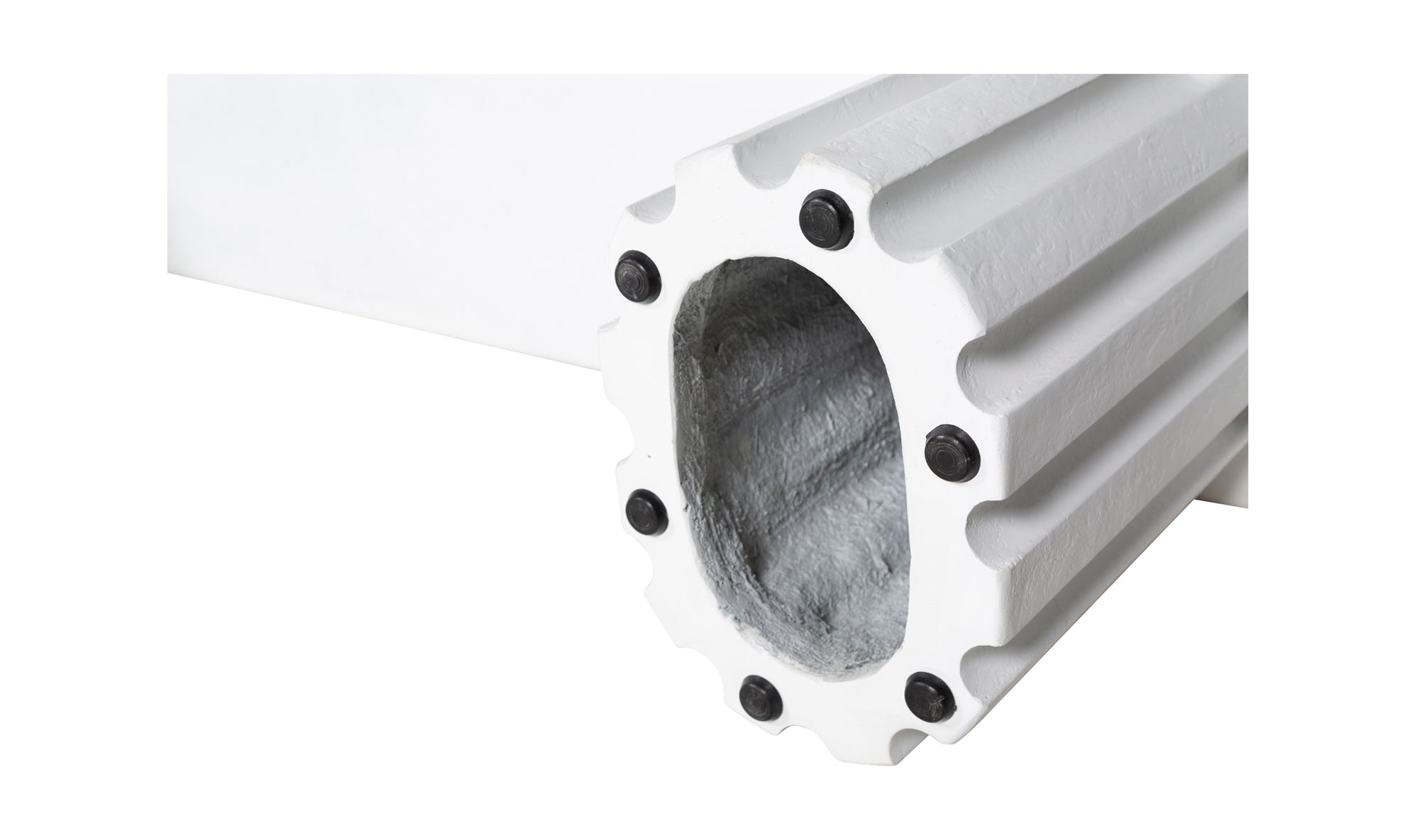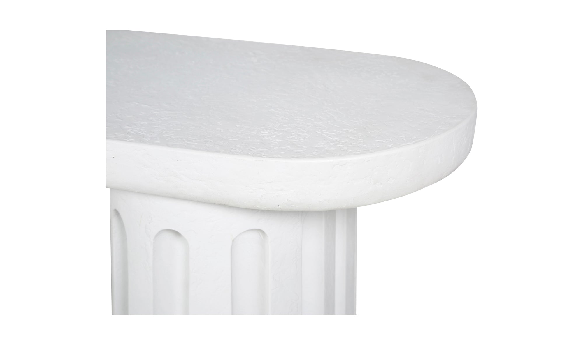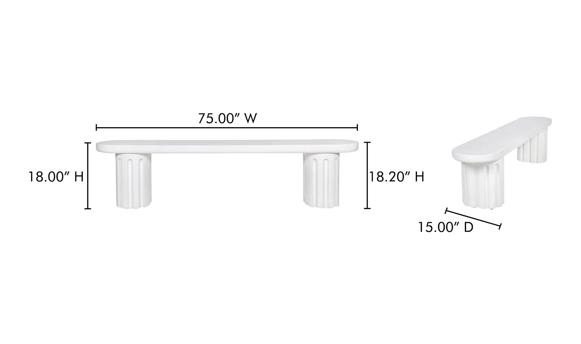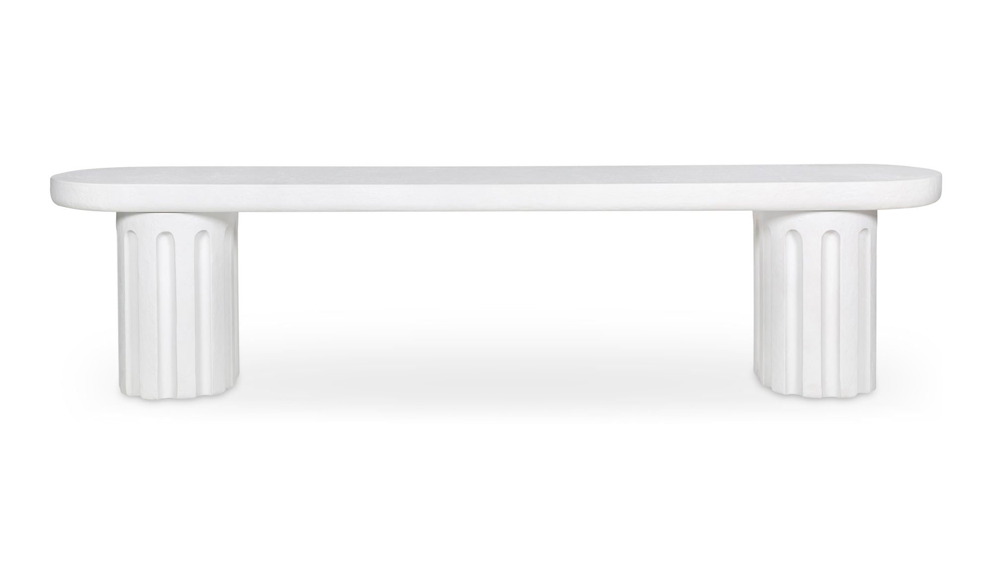 A striking interplay of shapes, the Eris outdoor dining bench embraces round forms with two column-like fluted sides. The rough concrete texture adds depth and complexity to an otherwise simplistic form, making it a statement piece suitable indoors and out. Exceptionally composed of Glass Fiber Reinforced Concrete (a fusion of cement, glass fiber, and Styrofoam), this bench offers unique aesthetics while maintaining its beauty.