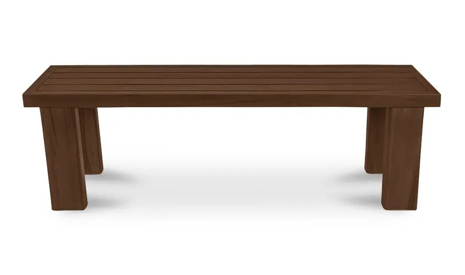 The Marina outdoor bench complements outdoor dining with refined simplicity. This modern slatted bench, crafted from solid teak with a brown finish, matches the silhouette of the Marina dining table. Its clean lines and durable construction make it a versatile seating option for the patio, garden, or poolside area, adding a touch of sophistication to the outdoor space.