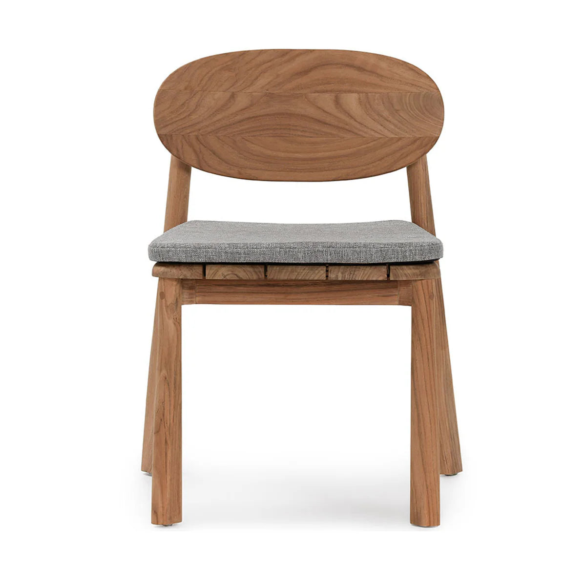 Transform your outdoor dining space into a modern retreat with this dining chair hand built from teak wood and topped with a weather-resistant cushion. Accented with reverse taper legs yet crafted with traditional techniques including dowel joinery, this chair offers a chic old-meets-new look that elevates any outdoor setting.