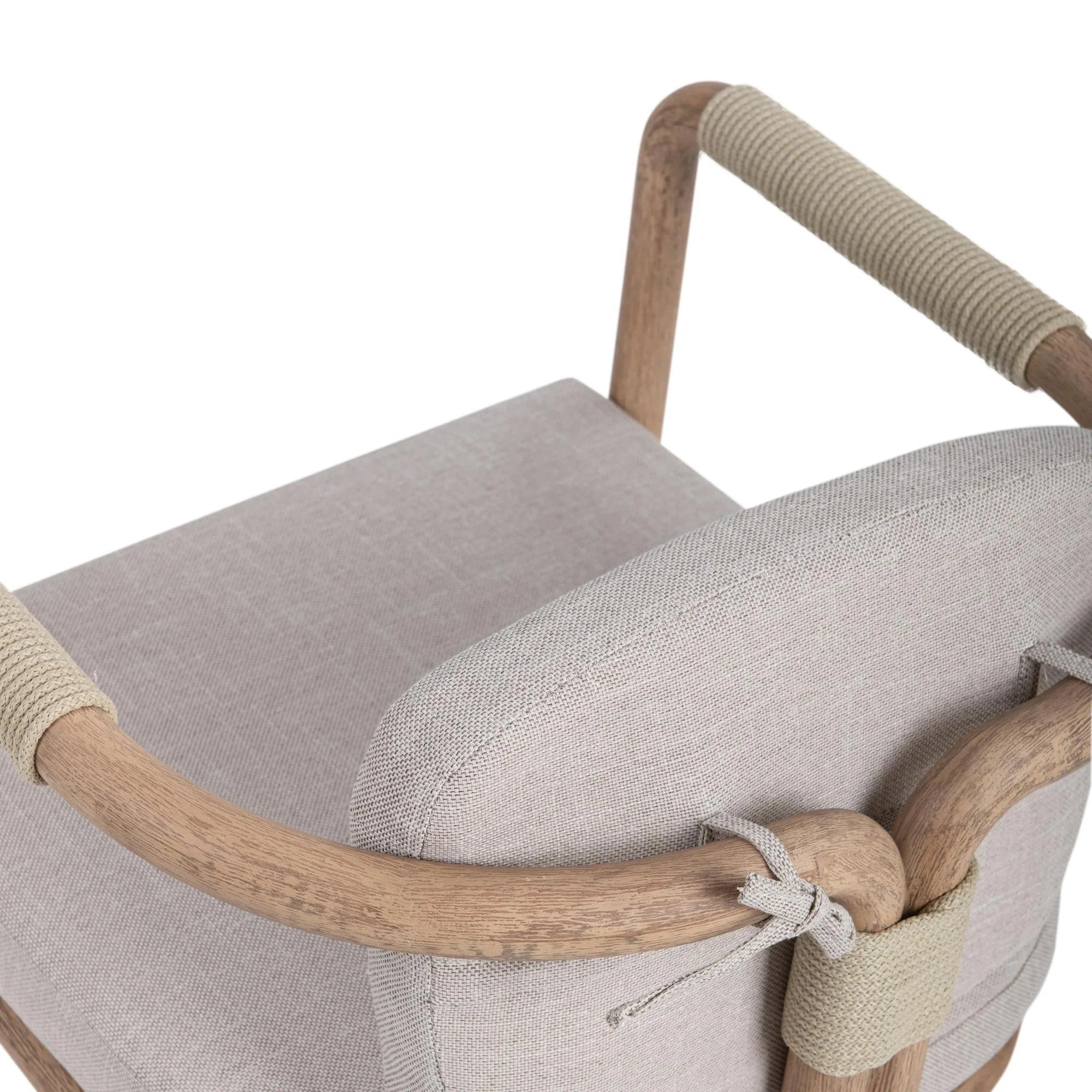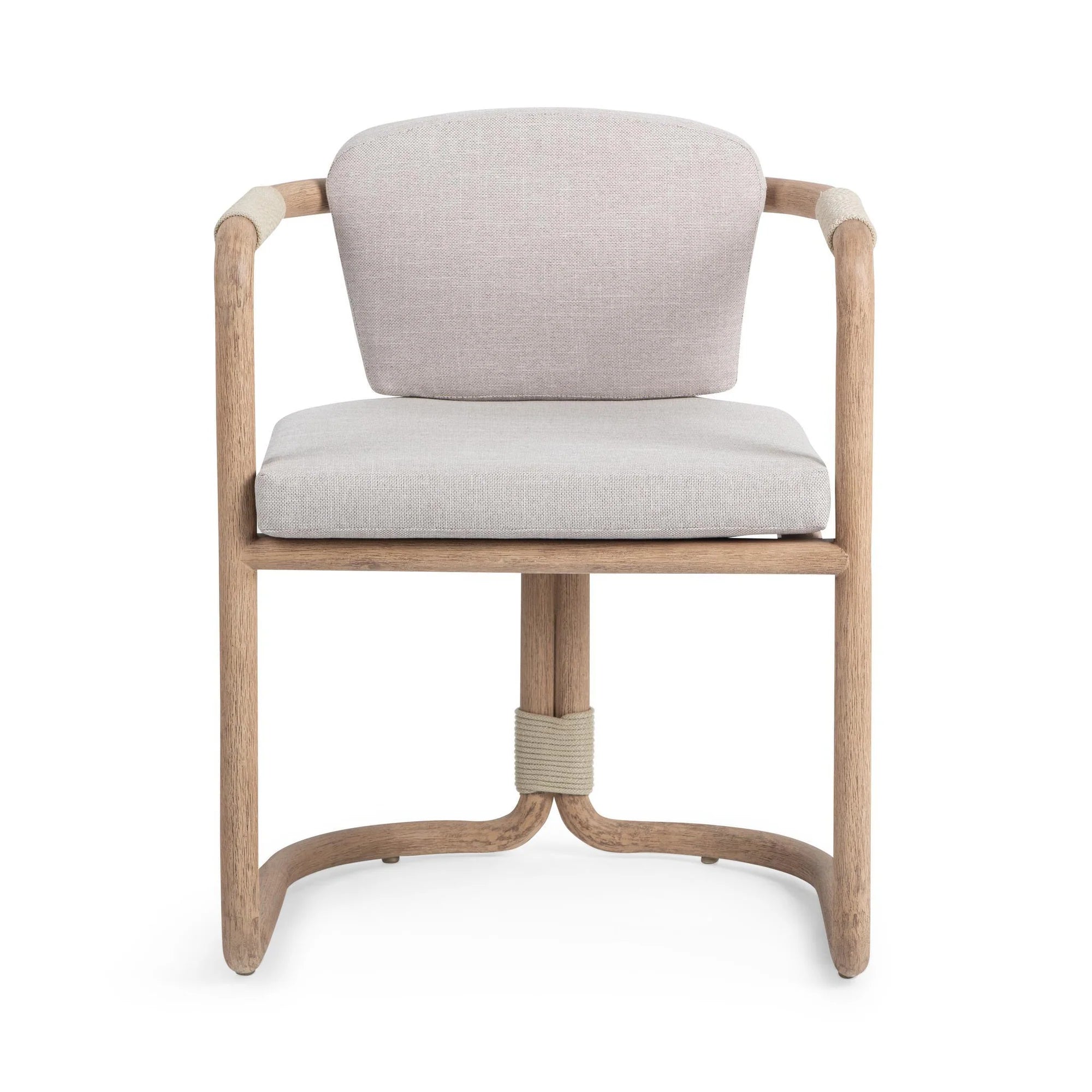 Bring comfort and craftsmanship outdoors with this inviting dining chair, designed for relaxed alfresco living. A gently curved eucalyptus wood frame creates an airy, sculptural silhouette, while woven rope detailing adds texture and warmth. Plush cushions upholstered in durable 100% polyester offer supportive comfort for lingering meals. Finished in soft, natural tones, this chair pairs beautifully with outdoor dining tables on patios, decks, and covered terraces.