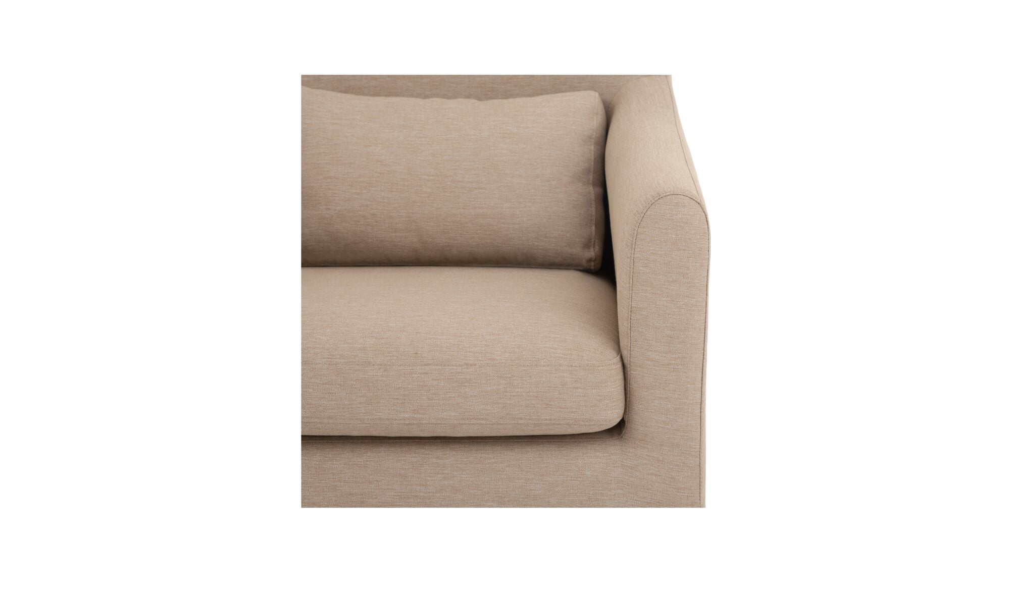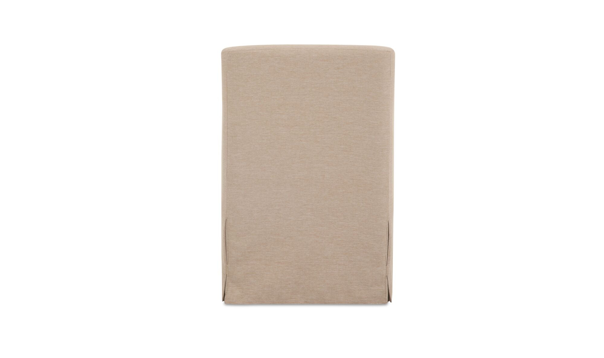 Make every outdoor meal feel considered. Lydia combines curved armrests with a light brown slipcover detailed by inverted pleats. Upholstered in recycled performance fabric, it’s supported by quick-dry cushions and an aluminum frame. A lumbar pillow adds comfort, while optional rollers allow for flexibility. A traditional profile built with smart outdoor materials, Lydia balances style and function in equal measure.