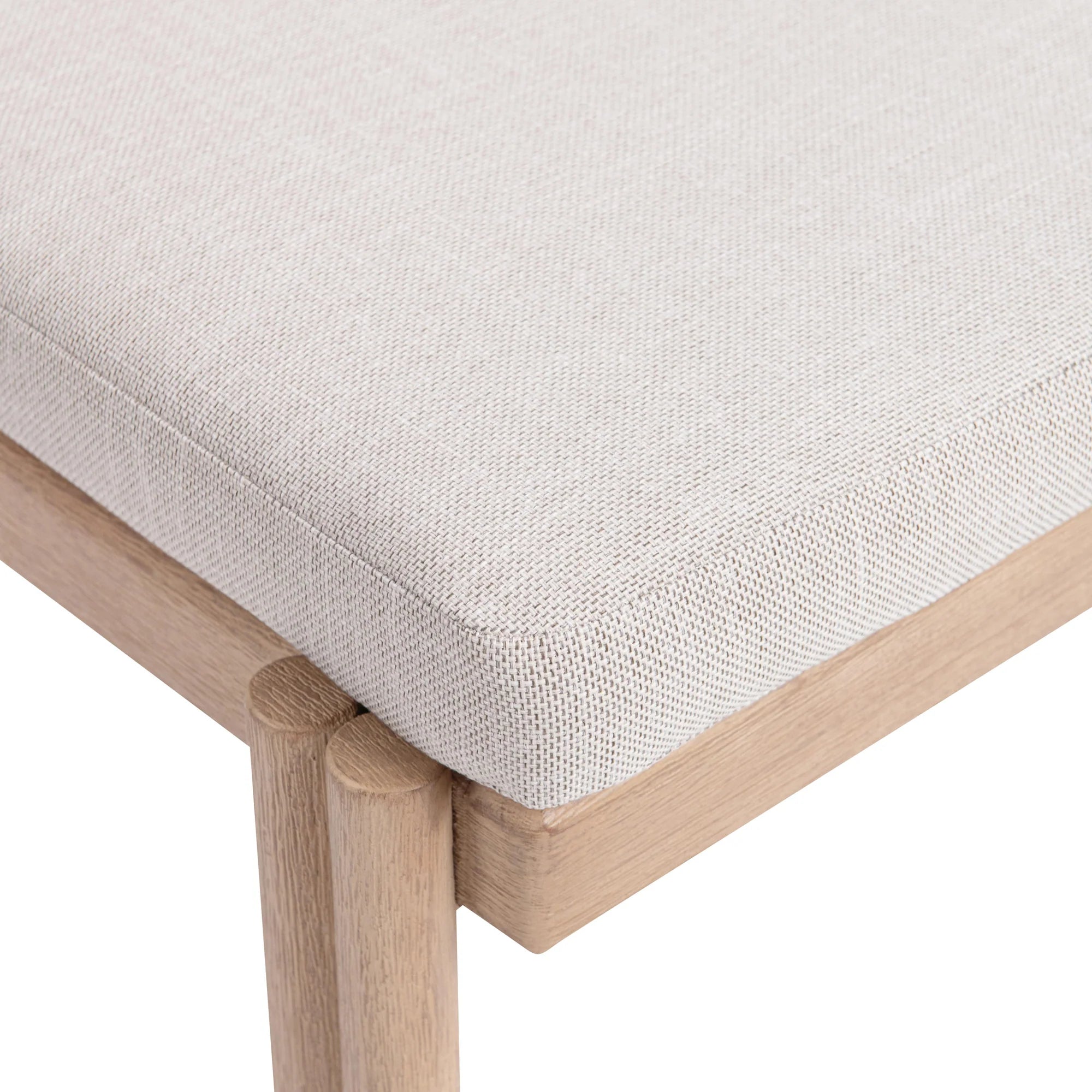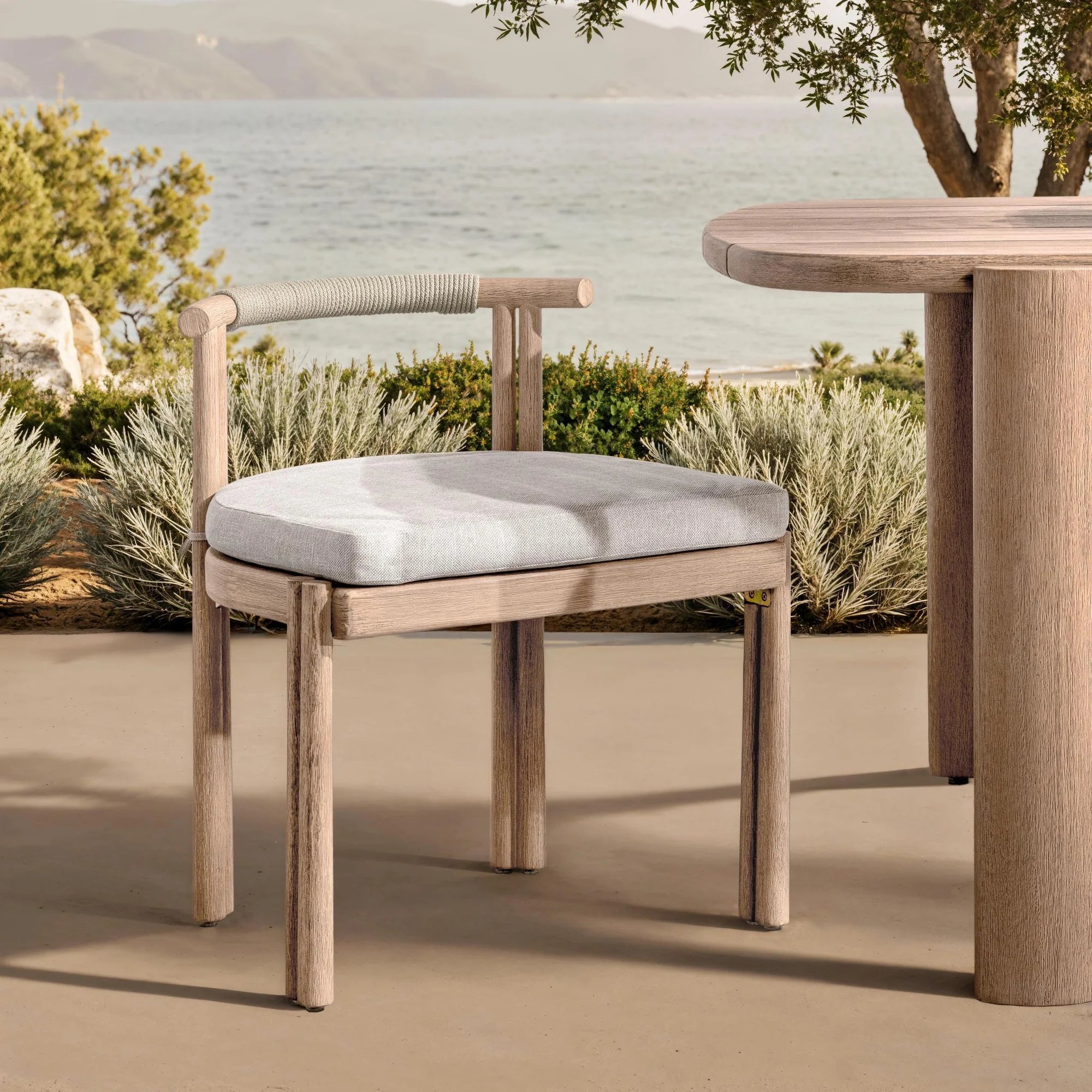 Elevate outdoor dining with this beautifully crafted dining chair designed for comfort and style. A solid eucalyptus wood frame creates a clean, airy silhouette, while rope detailing along the back adds subtle texture and craftsmanship. The generously padded seat, upholstered in durable 100% polyester, invites relaxed seating for long meals and conversations. Finished in warm, natural tones, this chair pairs effortlessly with outdoor dining tables on patios, terraces, and covered outdoor spaces.
