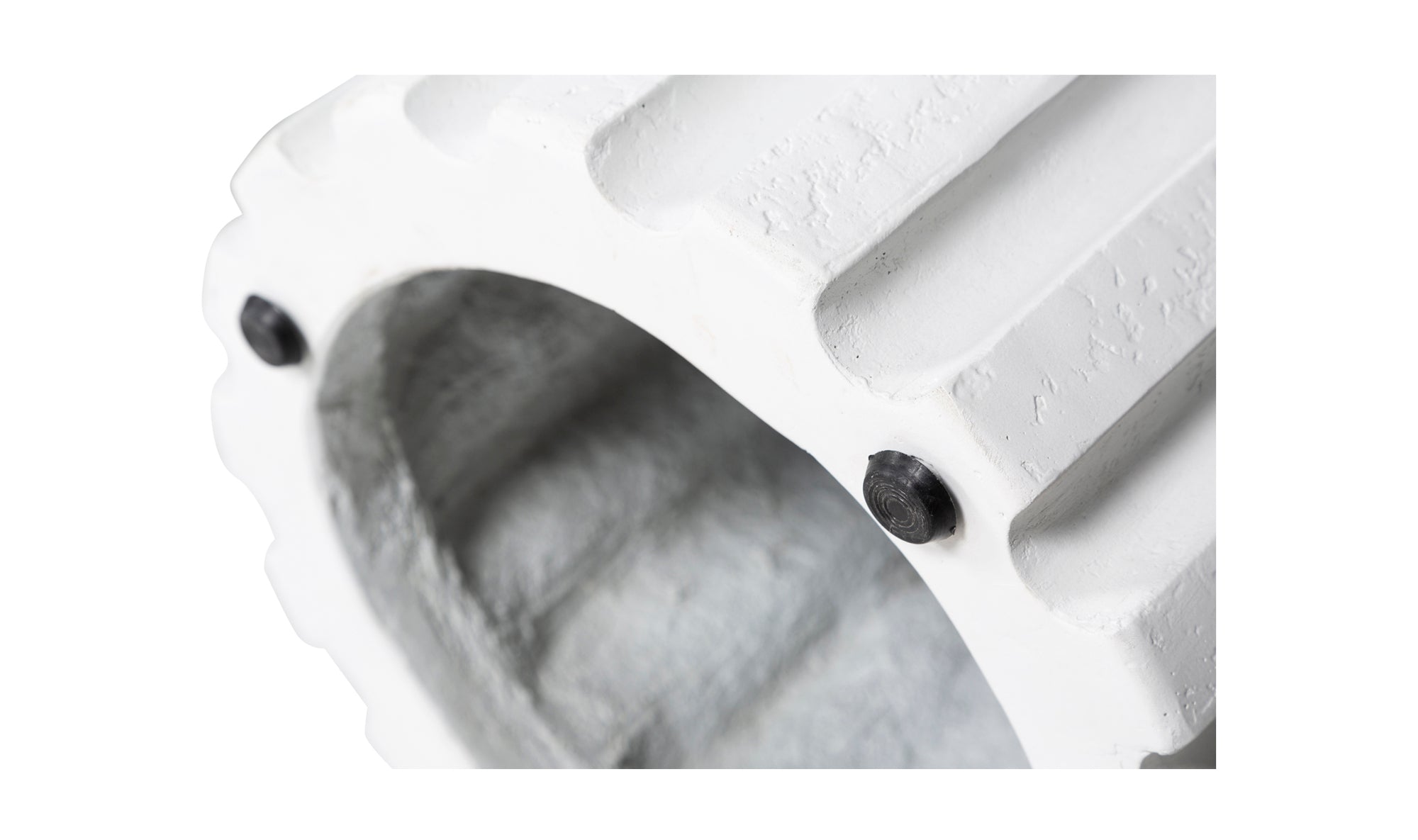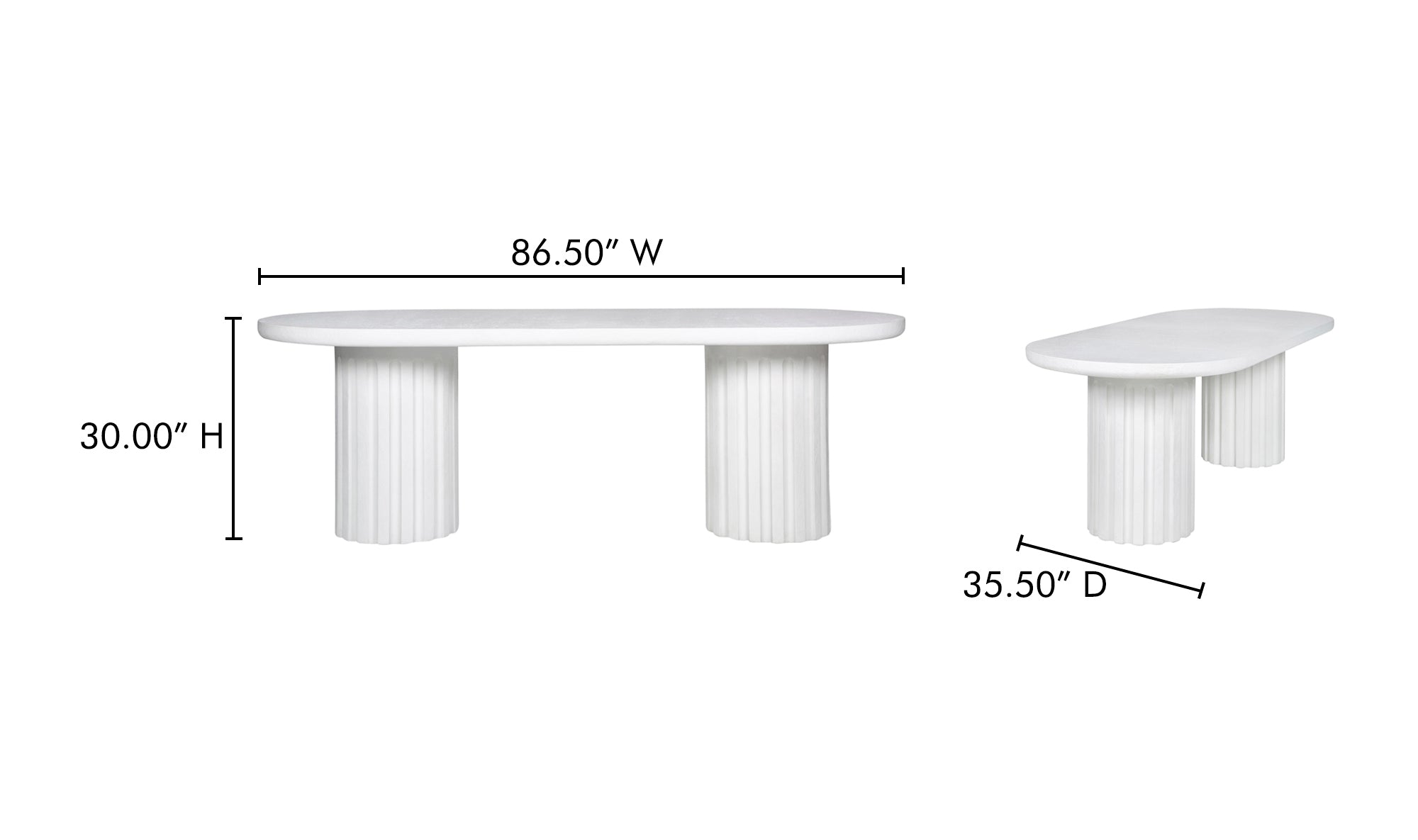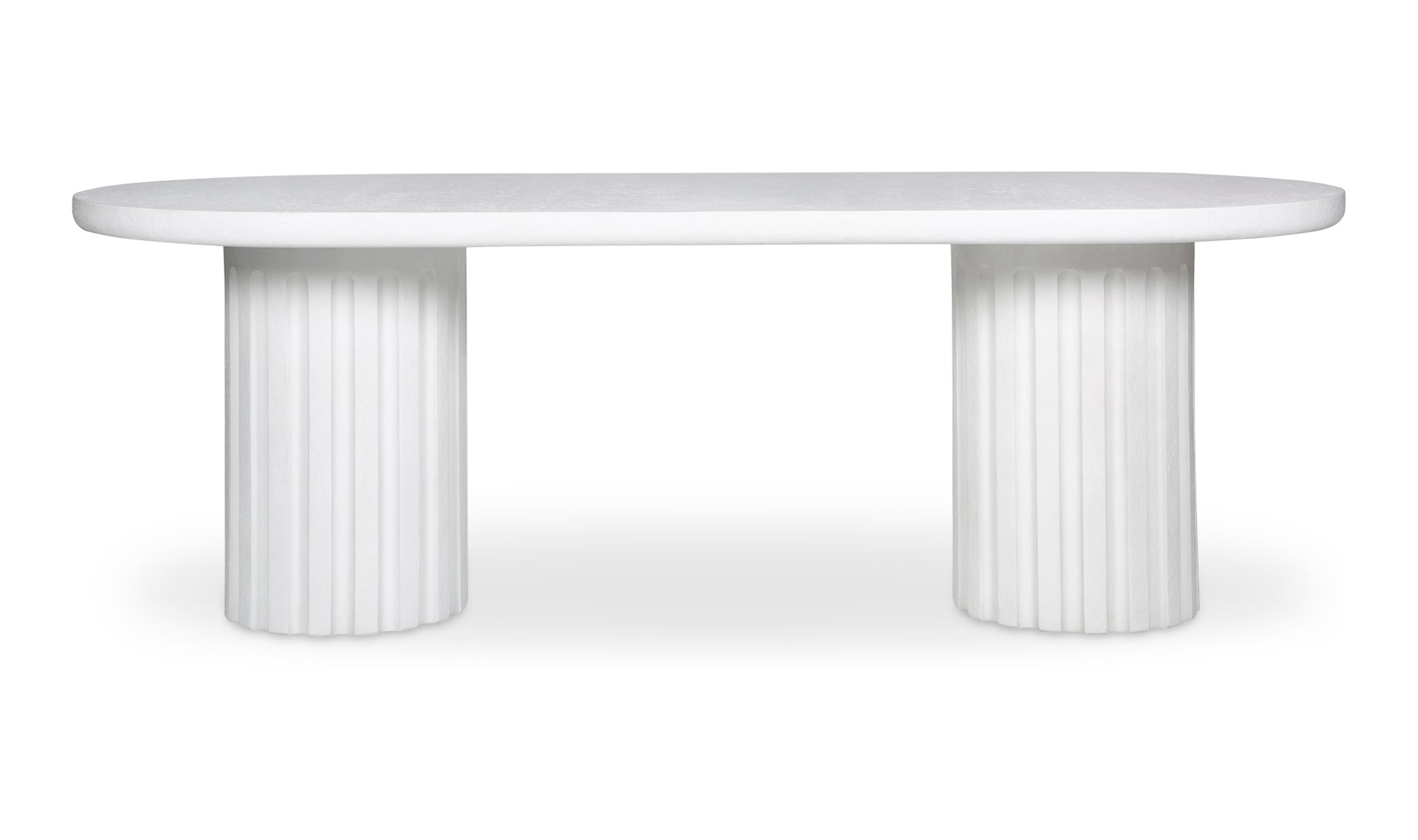 A striking interplay of shapes, the Eris outdoor dining table embraces round forms with a column-like fluted side. The rough concrete texture adds depth and complexity to an otherwise simplistic form, making it a statement piece suitable indoors and out. Exceptionally composed of Glass Fiber Reinforced Concrete (a fusion of cement, glass fiber, and Styrofoam), this table offers unique aesthetics while maintaining its beauty.