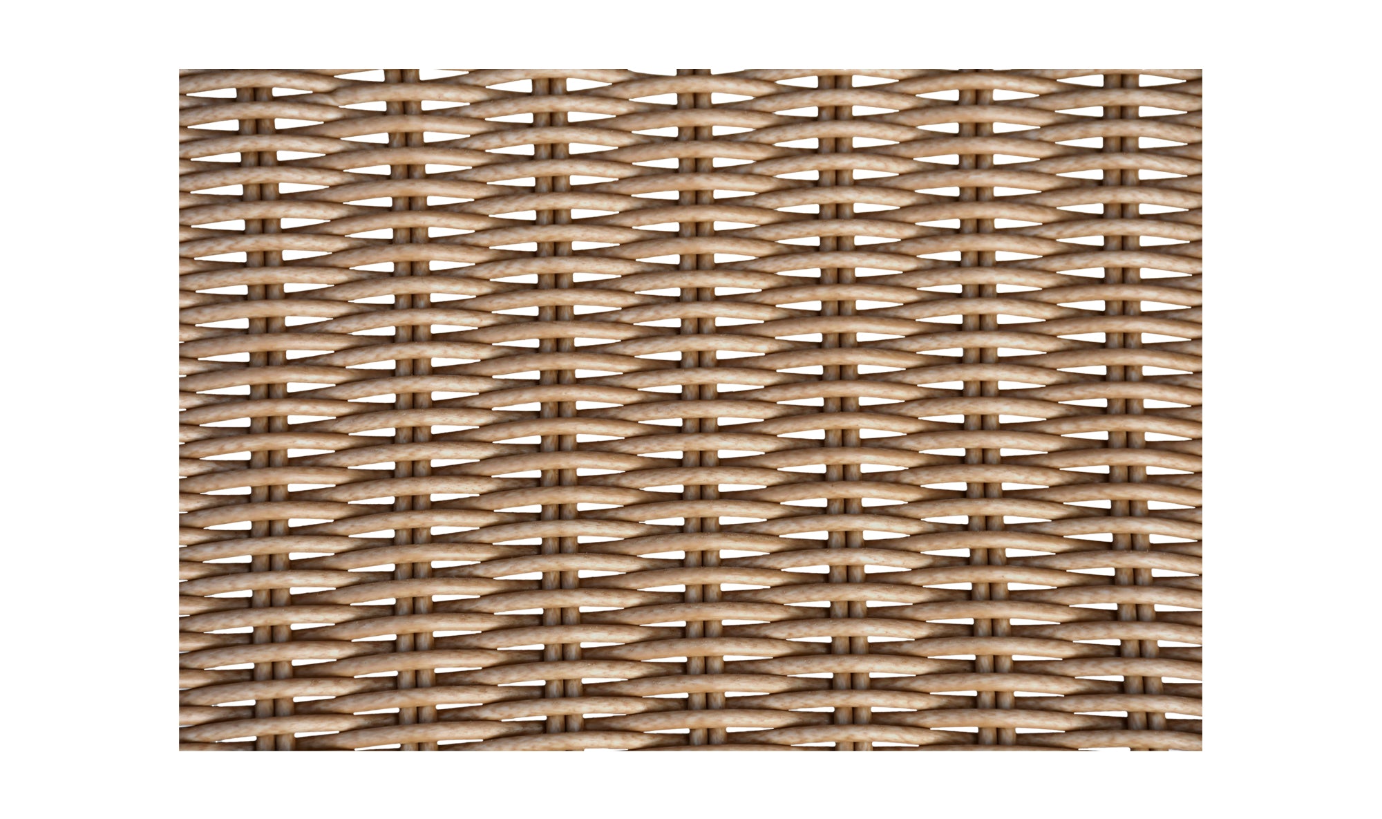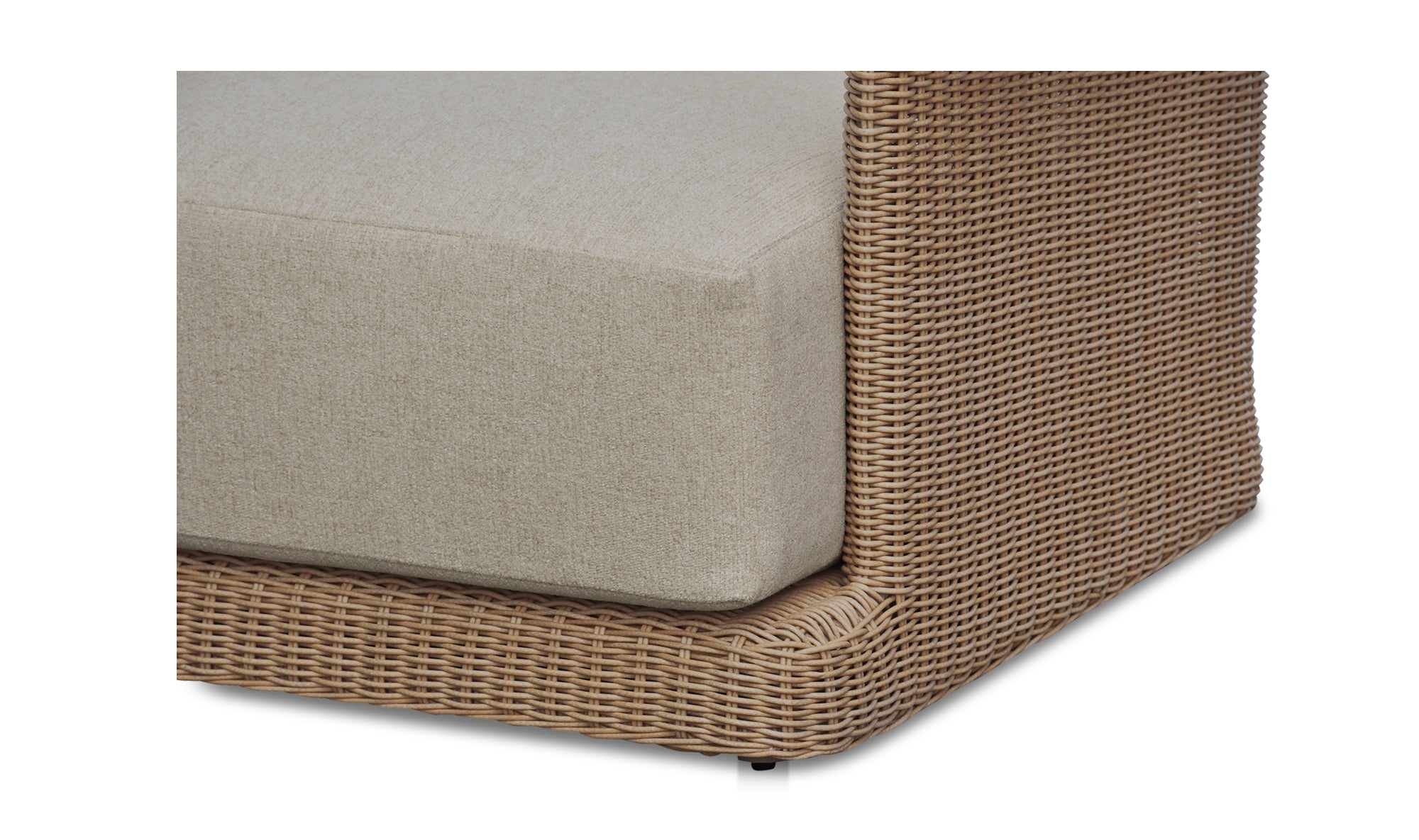 The Meredith sofa's graceful tulip silhouette and curved armrests create visual interest, while generous cushioning offers indulgent comfort. Artfully woven synthetic wicker over an aluminum frame marries durability with aesthetic appeal. Quick-dry foam and Dacron fiber ensure lasting resilience, while the sophisticated hue complements various exterior designs.