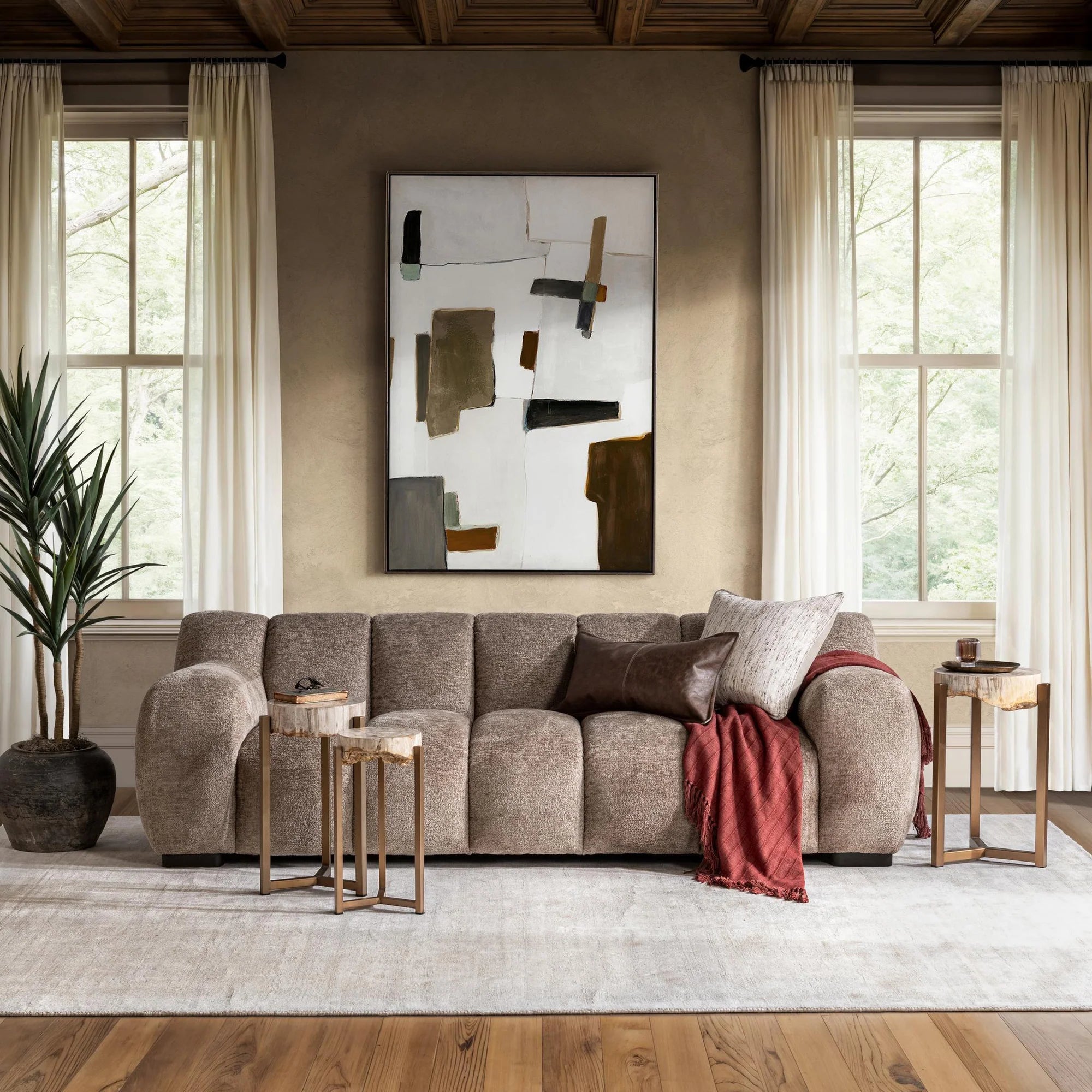 Wrap your living space in comfort with this plush, sculptural sofa designed for relaxed lounging. Upholstered in soft polyester, its generously padded, channel-style cushions create a cozy, cloud-like feel. Rounded arms and a low, grounded profile enhance its inviting silhouette. Supported by a sturdy parawood base, this sofa balances comfort and durability, making it an ideal centerpiece for living rooms that favor warmth, softness, and modern design.