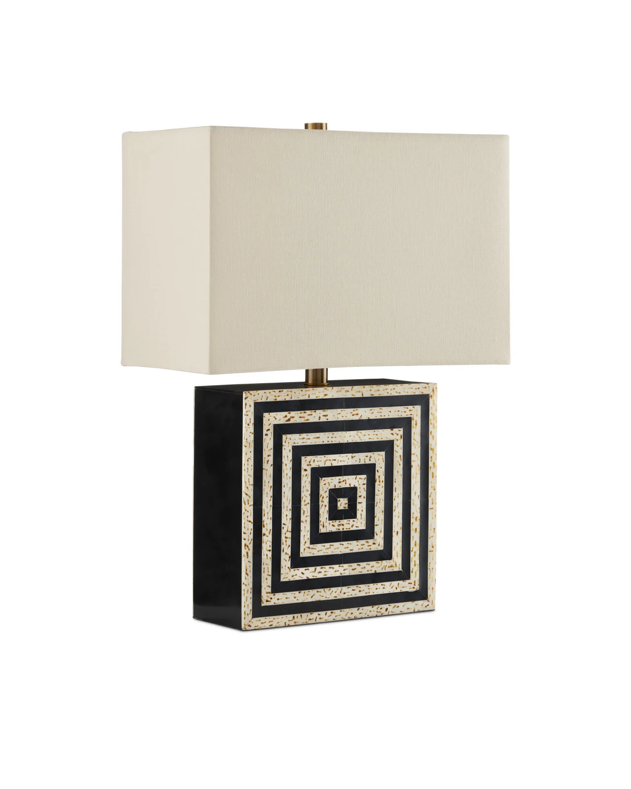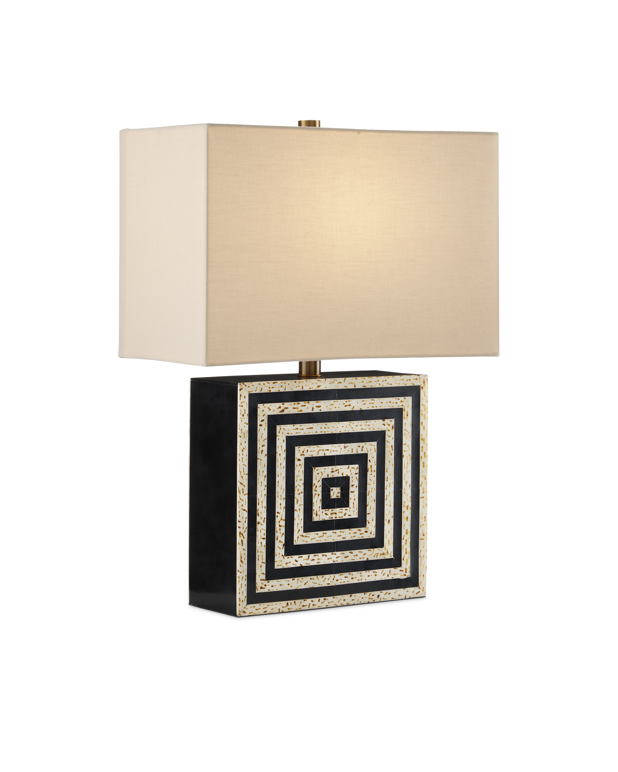 The Taurus Table Lamp has a number of artisanal aspects to its design and construction. The handmade ivory and black body has a mitered square that, paired with the perfectly scaled rectangular ivory shantung shade, completes a very balanced composition. Once the bone and composite materials have been fitted together in tidy lines, texture is achieved on the surfaces when artisans mark the white speckled bone with a branding tool. This level of specificity and the fact that the lamp is composed like an intricate puzzle make this a special accent piece designed by Aimee Kurzner.