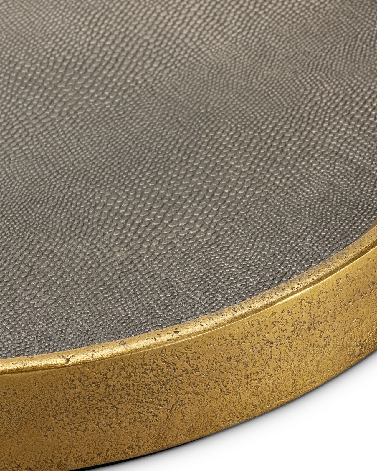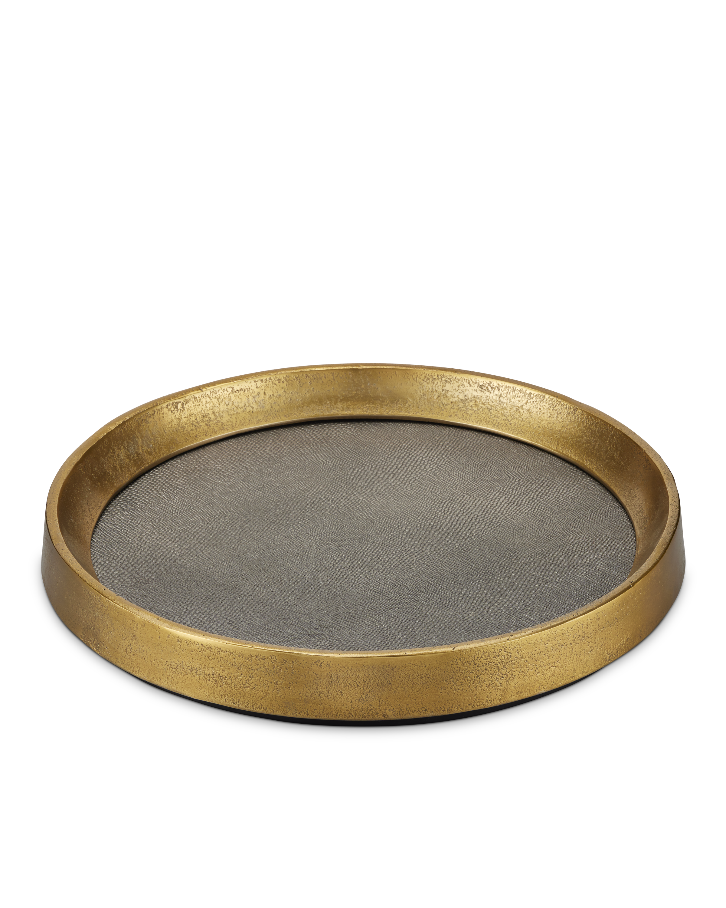The Tanay Round Tray has an incredible mix of textures. First is the cast aluminum rim that has tell-tale pitting on its gleaming antique brass surface. Adding even more dynamism is the bottom of its interior that is stamped in a graphite snakeskin pattern. This masterpiece of artistry will be a scene-stealer when used to carry cocktails or appetizers.